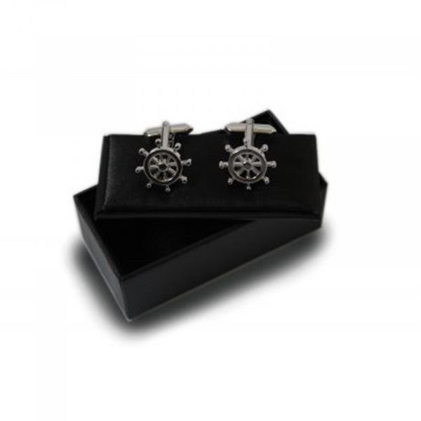 Schöne Manschettenknöpfe mit einem Steuerrad in Silberfarben. Sie sind rhodiniert und glänzend. Maß ca. 17 mm. Verpackungsgewicht: ca. 0.5 kg Die Manschettenknöpfe werden in einem hochwertigem Geschenk-Etui von der Marke GROM Schmuck prösentiert und versendet. Das Etui ist in einem Lederimitat und in den Farben schwarz-silber gehalten. Das Innere ist in samtbezogenen Schaumstoff. Die Grööe des Etuis betrögt 90 x 50 x 30 mm. Hergestellt in Deutschland